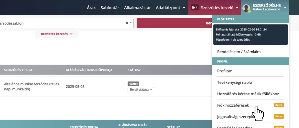 A szerződés létrehozásakor ki lehet választani a meghatalmazottak közül, hogy ki fog aláírni, illetve meghatalmazottként bármelyik megjelenített szerződést alá tudja majd írni a főfiók helyett is.