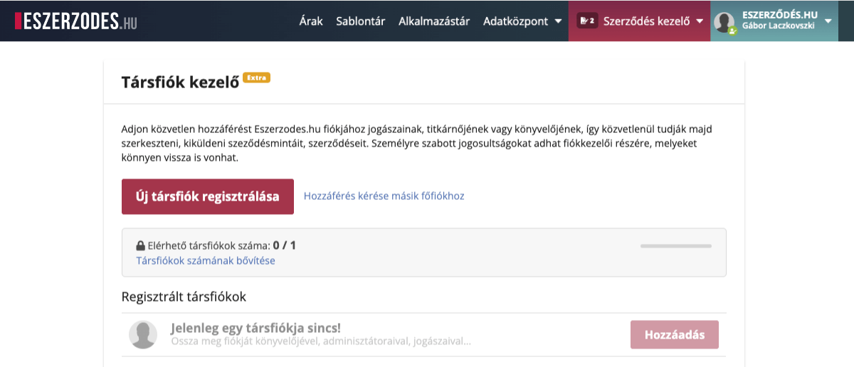 Ekkor még üres a társfiók listája. Az „Új társfiók regisztrálása” gombra kattintva adhat munkatársainak hozzáférést a fiókjához. A kiosztható és felhasznált társfiókok számát is ezen a felületen tudja nyomonkövetni.