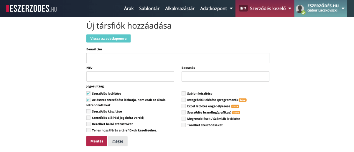A jogosultság kiosztásához adja meg a kezelő e-mail címét, nevét, beosztását és jogosultságait, majd kattintson a Mentés gombra.