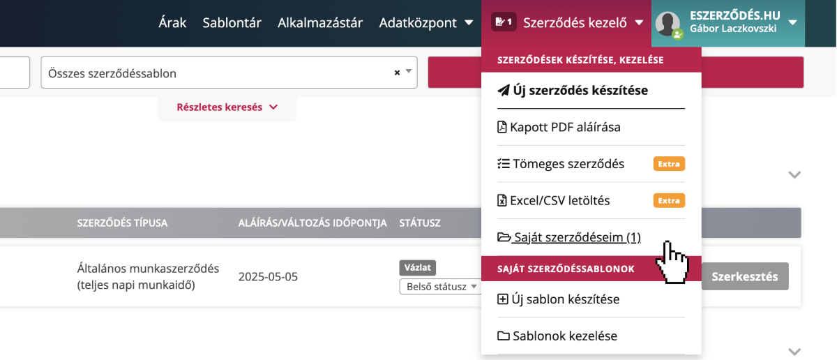 A Szerződés kezelő menüben válassza a Saját szerződéseim opciót, hogy megnyissa a központi irattár felületét.
