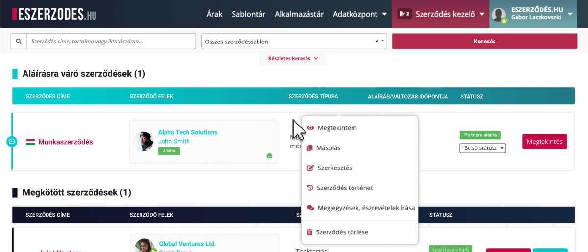 A listaoldalon a szerződésre jobb klikkelve egy kontextusmenüt nyíthat, ahonnan egyetlen kattintással elérheti a legfontosabb műveleteket (megtekintés, másolás, szerkesztés vagy törlés). Így minden gyakori feladatot gyorsan elvégezhet anélkül, hogy először meg kellene nyitnia a szerződést.