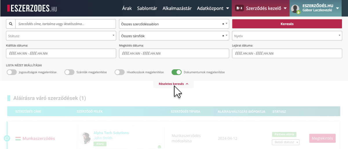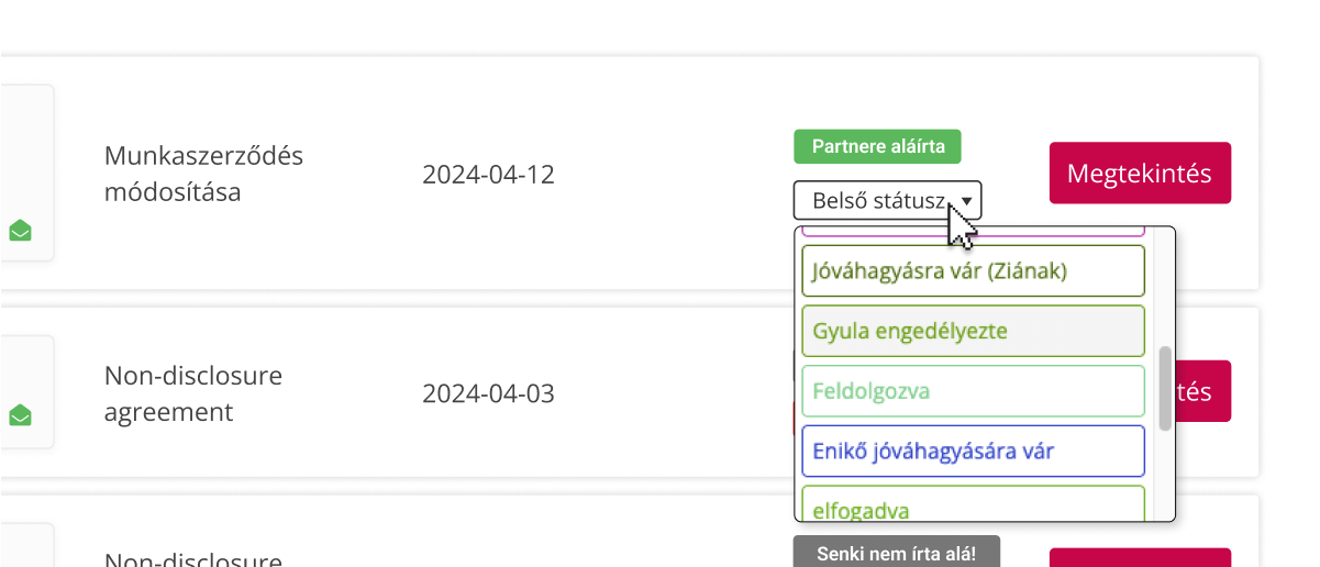 Saját elnevezésű belső státuszokat is hozzárendelhet a szerződésekhez, melyekre rá is szűrhet a keresőben. Így pontosan követheti és menedzselheti a belső munkafolyamatokat.