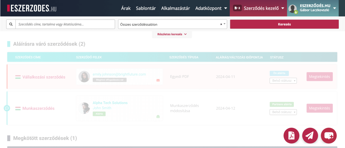 A képernyő jobb alsó sarkában található lebegő gyorsmenükkel egyetlen kattintással indíthat új szerződést. Így villámgyorsan hozzáférhet a sablonokhoz és azonnal elindíthatja a dokumentum létrehozását anélkül, hogy legördülő menüpontokat böngészne.