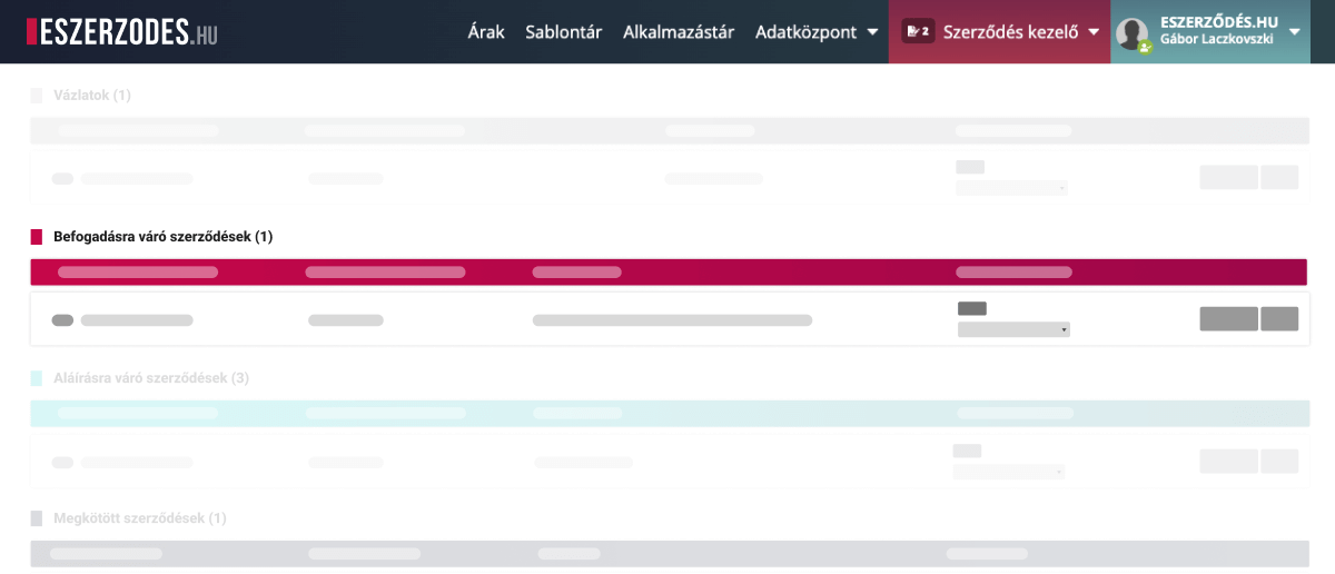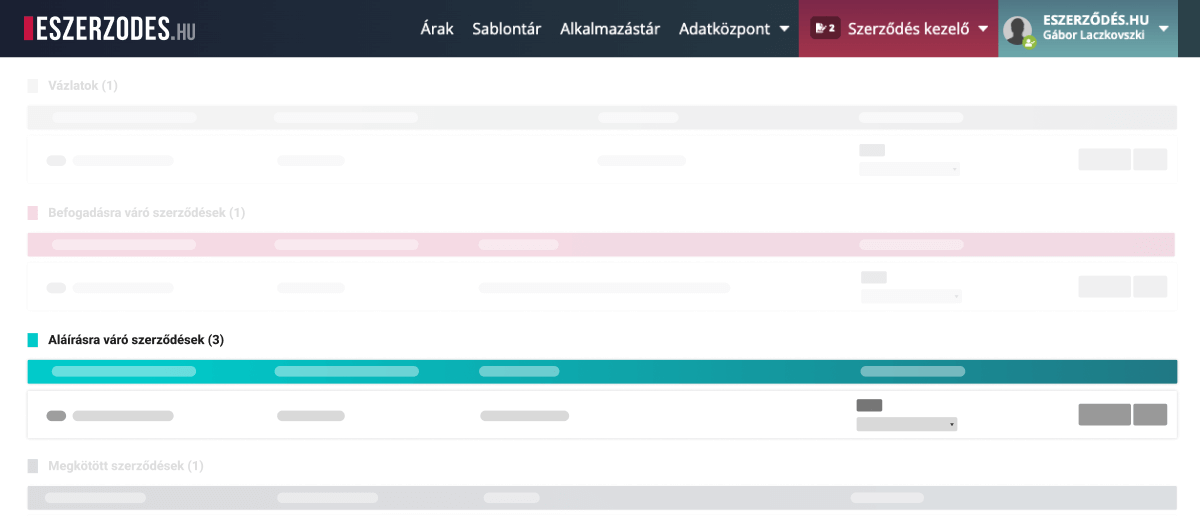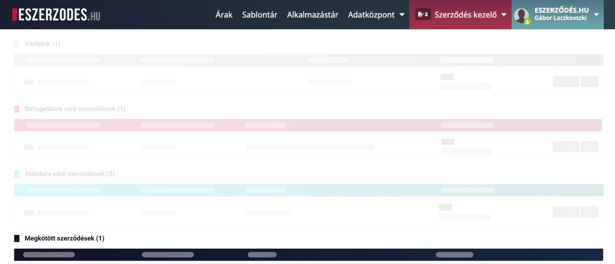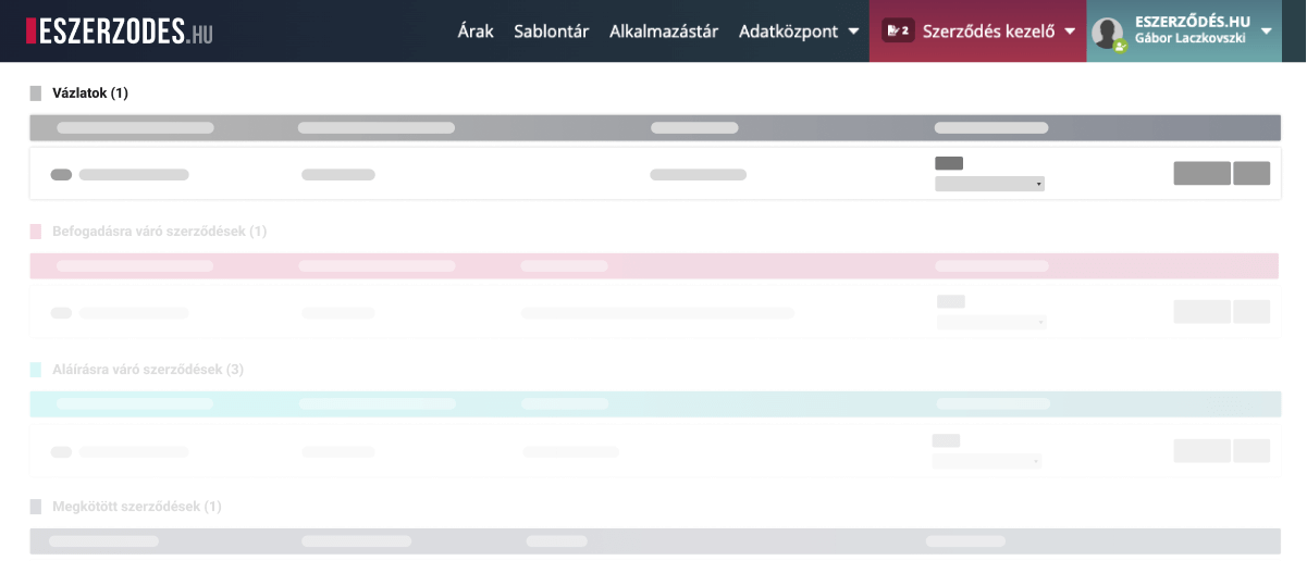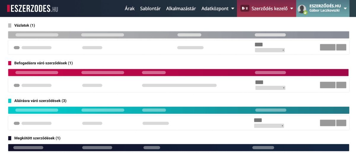 A Szerződéskezelő felület automatikusan négy dinamikus szekcióba sorolja a dokumentumokat, így mindig könnyen áttekintheti, hol tart egy-egy ügy. Minden szekciót külön szín jelez, hogy vizuálisan is elkülöníthesse a folyamatokat.