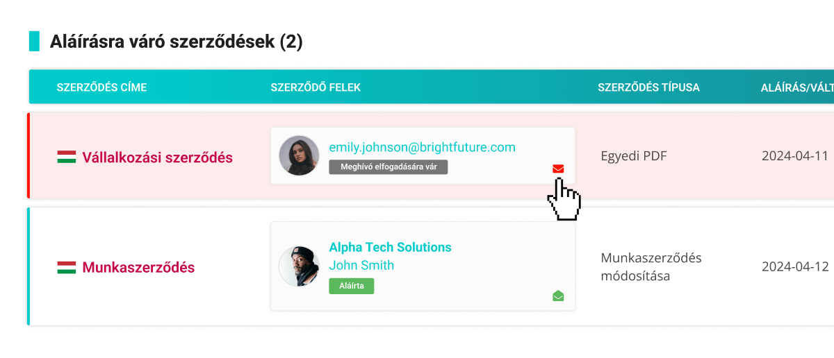 Az email követés funkció valós időben jelzi Önnek, hogy az elküldött szerződésértesítők közül mely levelek pattantak vissza, melyeket kézbesítette a rendszer, és melyeket nyitottak meg, kattintottak át a címzettek. Így azonnal láthatja, ha probléma akadt a kézbesítéssel, vagy ha a partner már értesült a szerződésről, és még hatékonyabban követheti nyomon a kommunikáció státuszát.