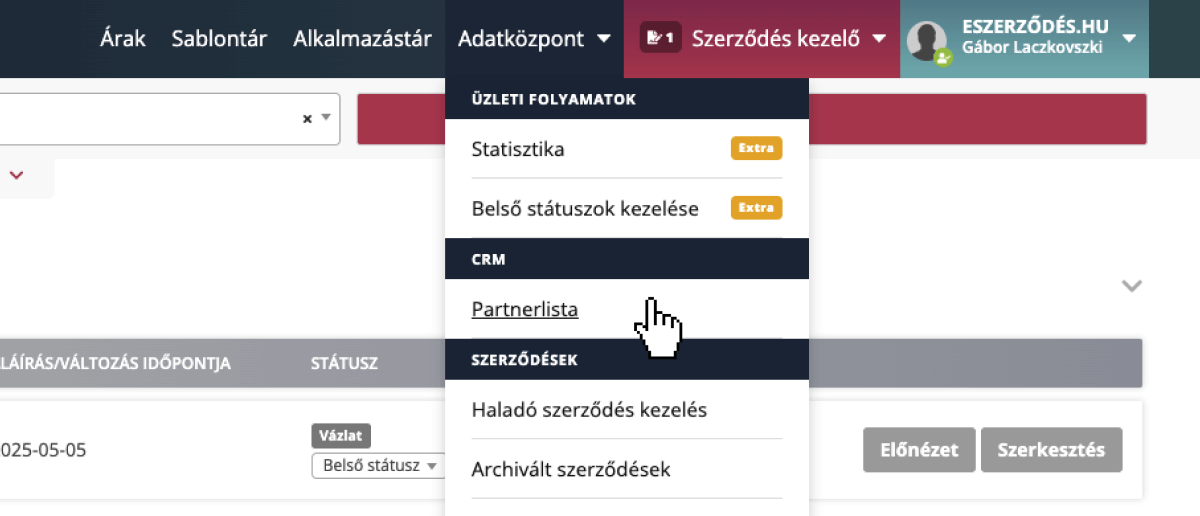 Az Adatközpont menüben válassza a CRM-csoporton belül a Partnerlista opciót, hogy megnyissa a szerződött partnereket listázó felületét.