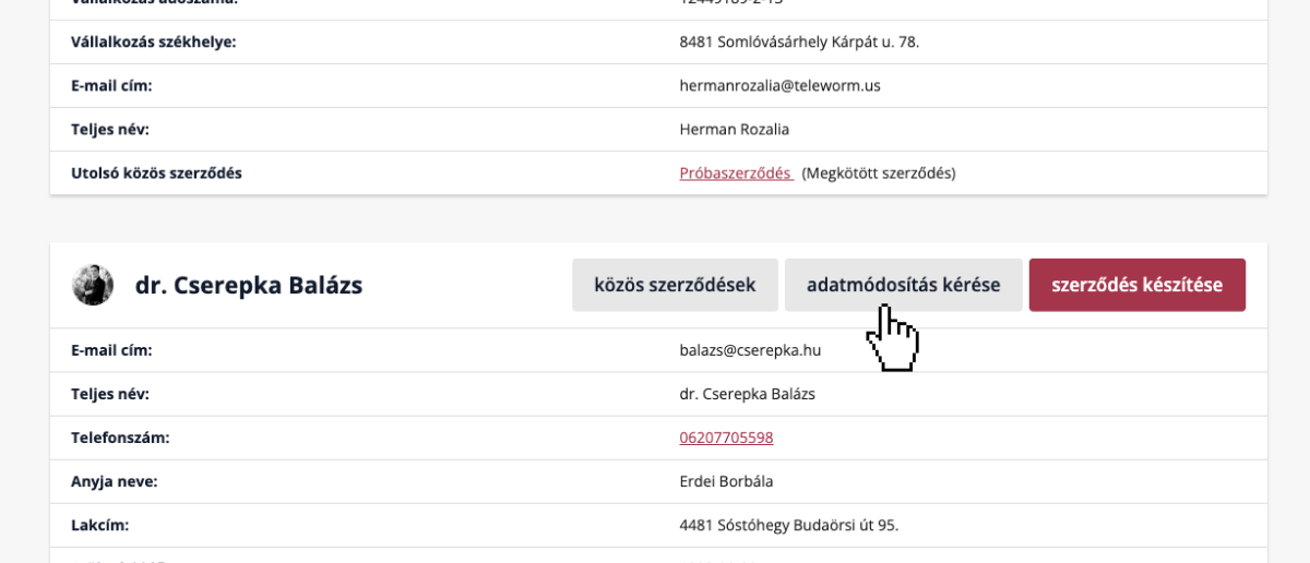 Az Adatmódosítás kérése gombbal elküldheti partnerének a frissítésre szánt adatokat, melyeket ők egyetlen kattintással jóváhagyhatnak. Így még a digitális térben kevésbé jártas felhasználók is könnyedén naprakésszé tehetik adataikat.