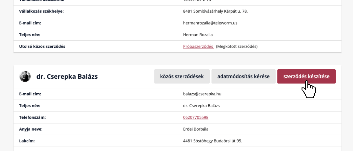 A Szerződés készítése gombra kattintva egyszerűen indíthat új szerződést az adott partnerrel.